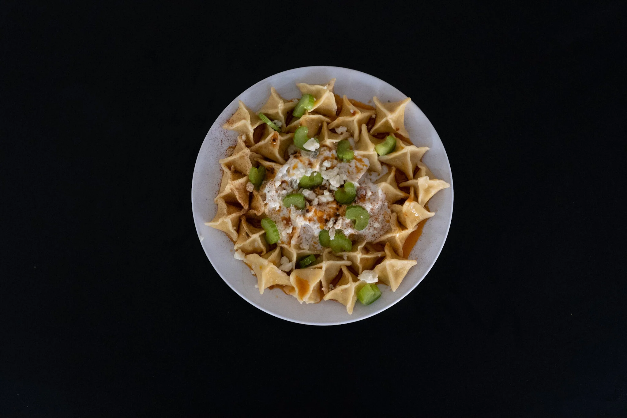 On top of your Manti add a few scoops of Garlic Yogurt and drizzle the Hot Sauce Butter over. Add your Gorgonzola Crumbles and chopped celery. Go crush it and report back.