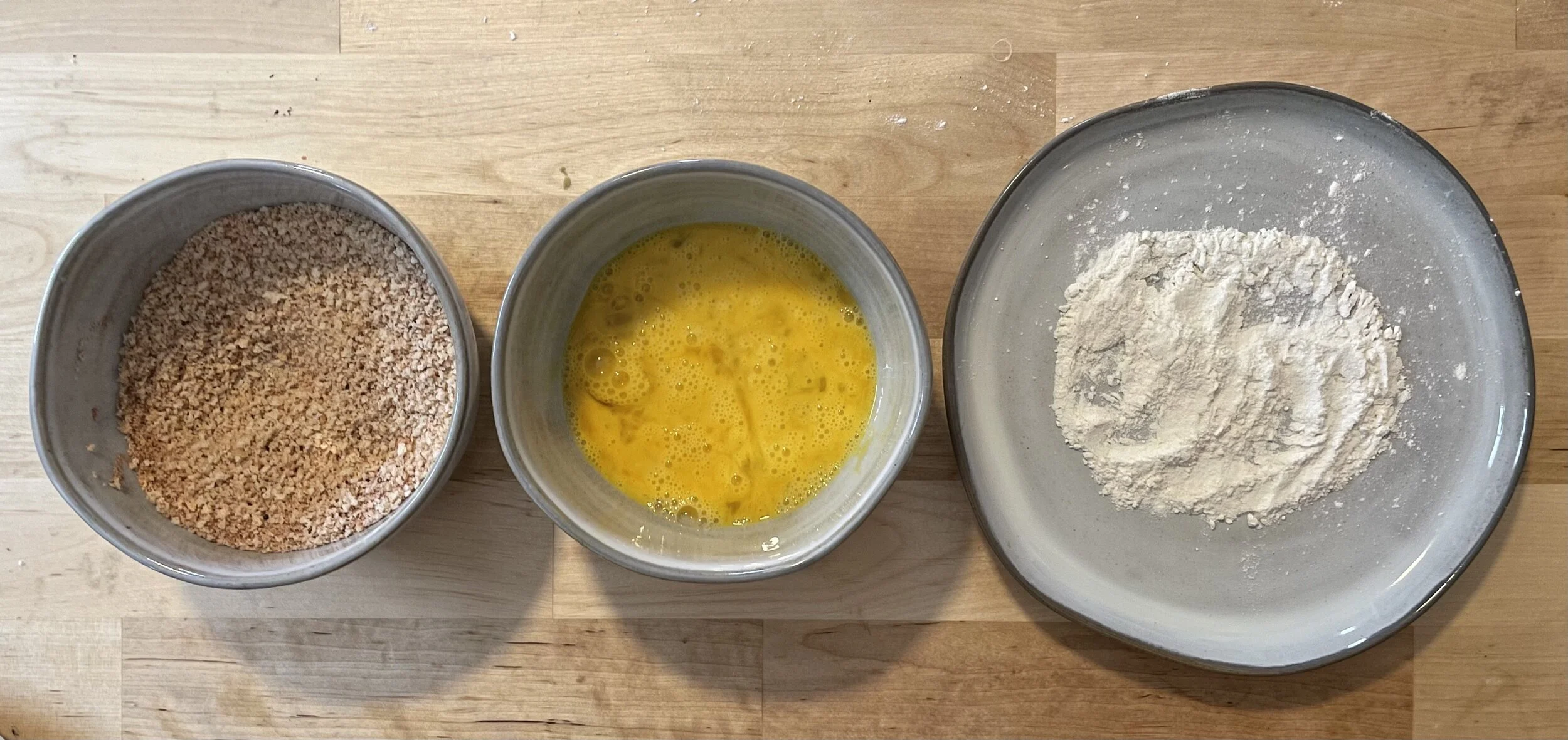 When your Béchamel has solidified, take it our and form small balls. On the stove heat a pan with olive oil. It should be enough to form a small layer on the bottom of the pan. Roll in flour, followed by beaten egg and then a panko mixture. I mix my panko with paprika and garlic powder with a small amount of salt and black pepper.
