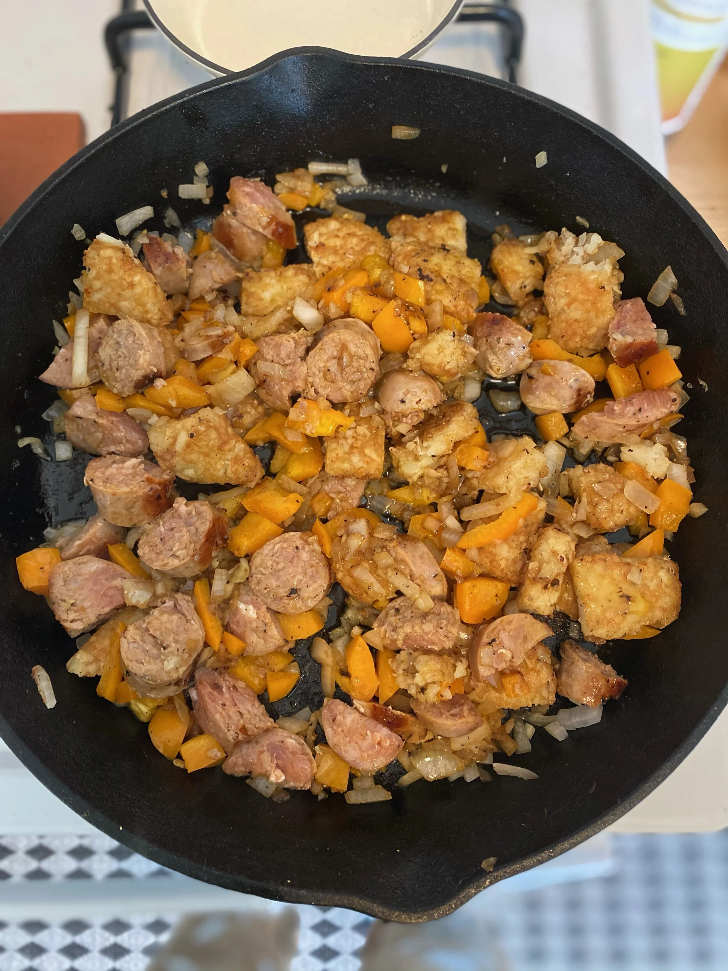 In a cast iron skillet saute your sausage for about ten minutes, they should be partly cooked through, but not completely. Remove sausages from heat and add your olive oil, peppers, onions, and hash brown pieces. Sauce until onions are translucent. Cut sausage into half slices and add back into the pan. Add your paprika, salt, and pepper. After a few minutes turn heat off.