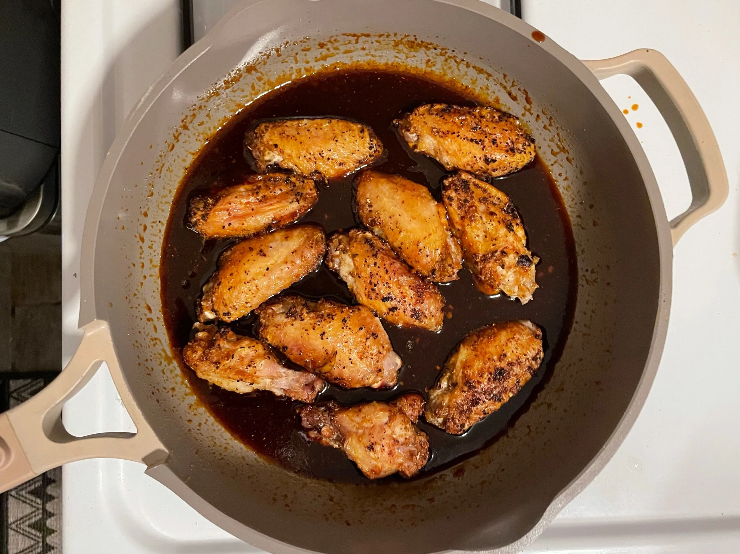 When the wings are done dip them in the sauce using tongs to fully coat them. Plate and sprinkle with sesame seeds.
